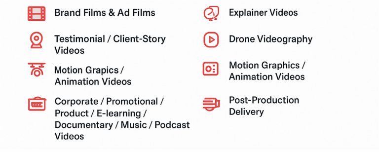 - Corporate / Promotional / Product / E-learning / Documentary / Music / Podcast Videos